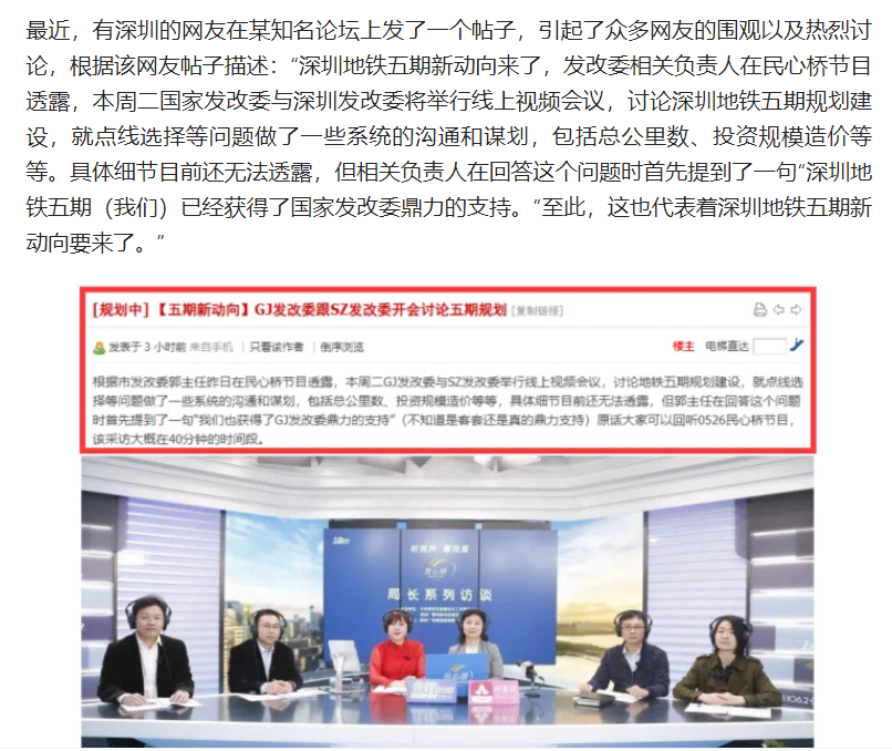 如今,深大城际在深圳多个地点同时开工,深惠城际(深圳段)、穗莞深城际延伸段也都动工了。但深圳城市轨道交通五期的规划,尚未获得批复并公布。每个城市的轨道(地铁)交通建设,都需要国家发改委的审批。深圳城市轨道交通的4期,是2017年7月获得的发改委批复;此后,又在2020年4月做过一次调整,也获得了发改委的批复。如今,四期基本上已经完成,深圳需要上报5期的规划,并获得批准。关于深圳地铁5期的进展,下面这张截屏提供一些信息:也就是说,深圳“城市轨道交通5期”有较大概率在年内获得突破!有三个背景或者条件,对深圳获批一个规模较大的5期,非常有利:*,面对经济下行压力,国家力推大基建,支持有效益的项目上马;