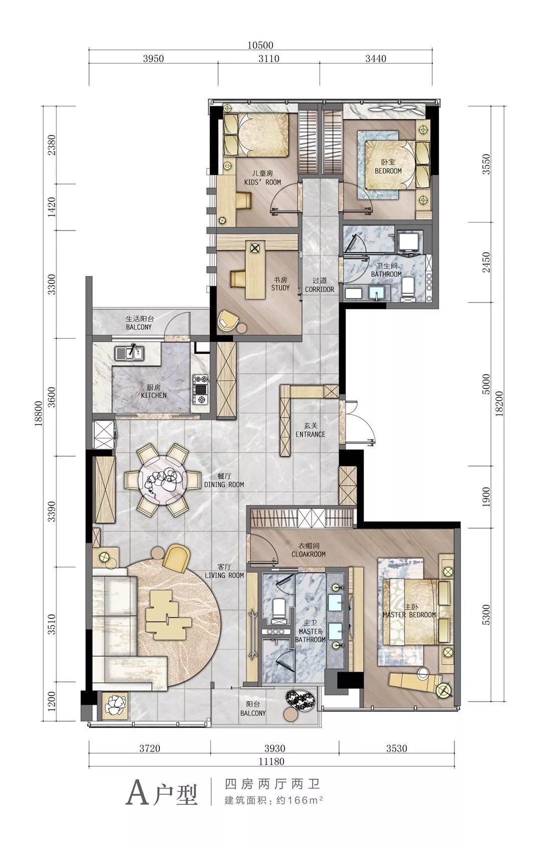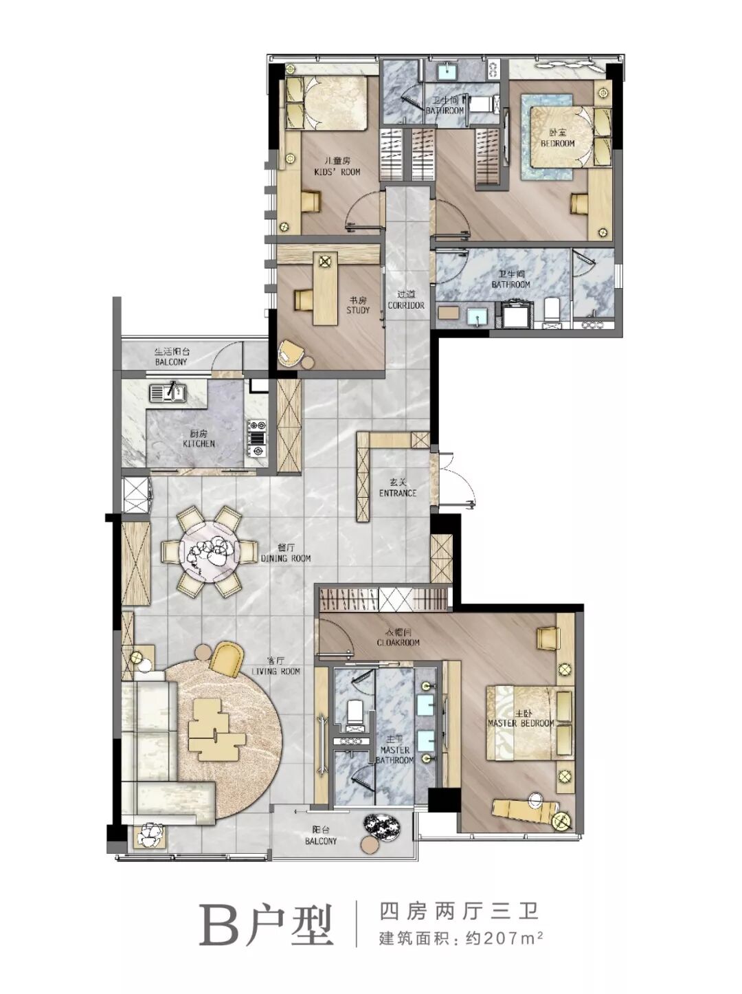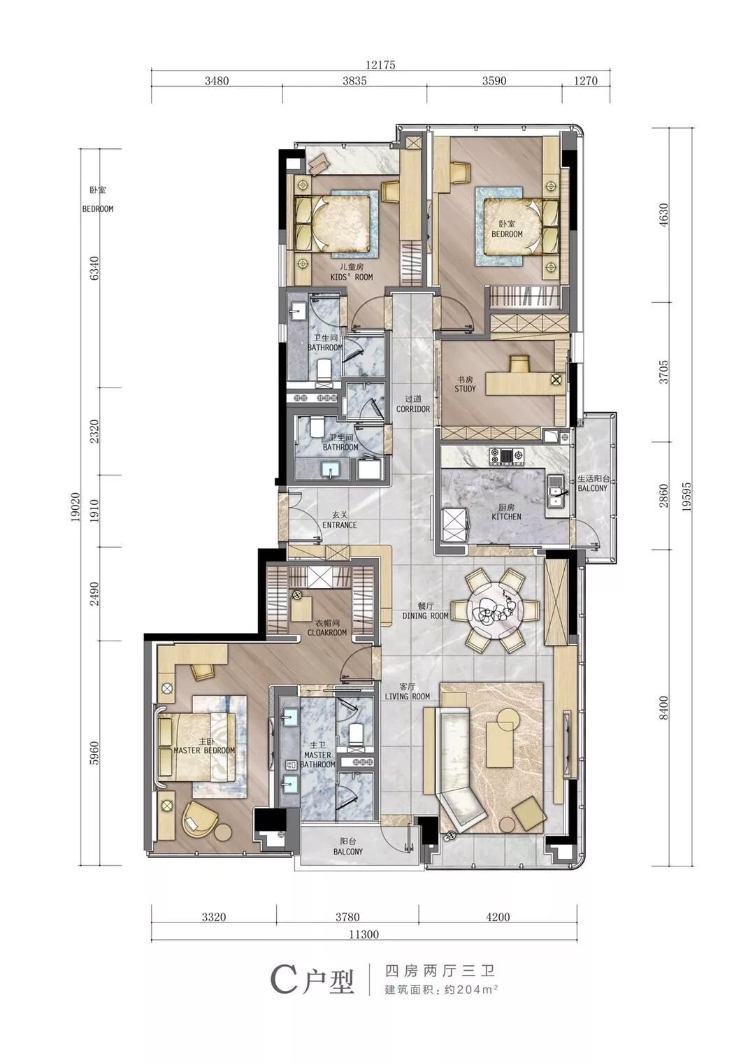 以建面约204㎡四房单位为例,其客餐厅面宽约8.4米,阳光可*大限度倾洒进来。