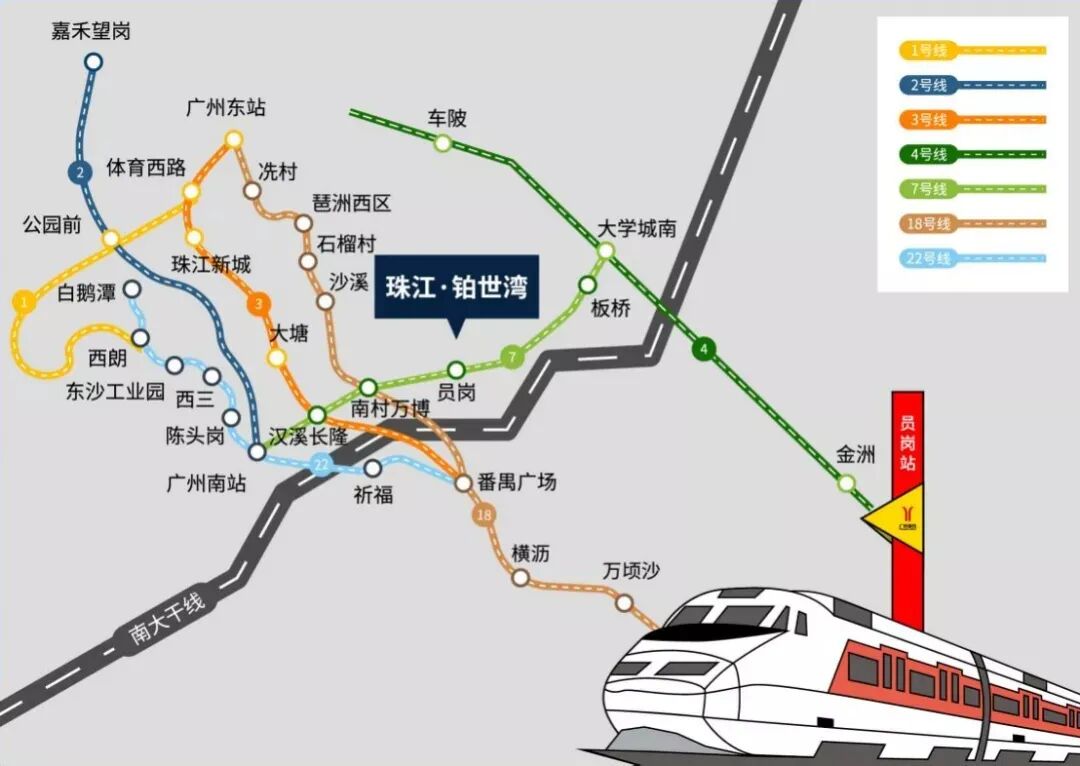 交通:7号线员岗站,1站到(南村万博)可换乘18号线(在建),2站到(汉溪长隆)转3号线、2站到(大学城南)转4号线、6站到(广州南站)转2号线。