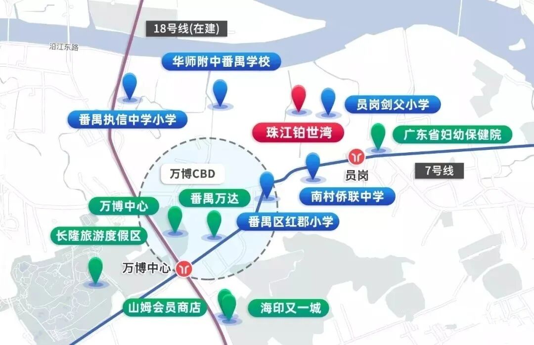 珠江铂世湾,500亩江岸地铁生态大城,位于番禺万博CBD,地铁7号线员岗站旁,4站可达珠江新城,8万㎡江山帝景高尔夫旁,园林面积约10万㎡;项目重磅引进公立华附番小,周边全龄段周边教育齐全;比邻番禺万达广场、长隆国际旅游度假区等醇熟配套,离万博商务区仅一个地铁站距离!