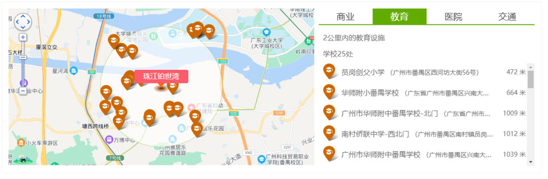 周边一公里内,便环伺有华师附中番禺学校、番禺执信中小学、员岗剑父小学、南村侨联中学等多所精英学府。