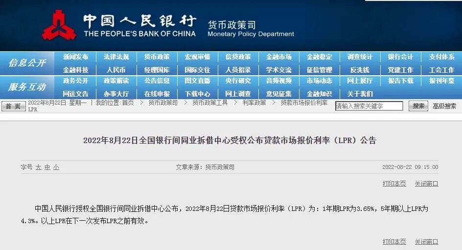 中国人民银行授权全国银行间同业拆借*公布,2022年8月22日贷款市场报价利率(LPR)为:1年期LPR为3.65%,5年期以上LPR为4.3%。以上LPR在下一次发布LPR之前有效。