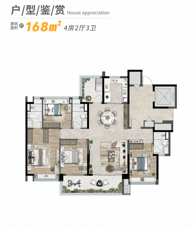 建面约168㎡4房,尽展大宅尺度,为改善而来。