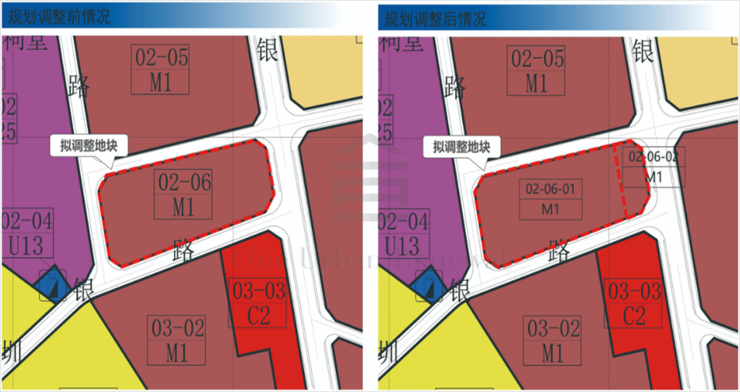 02-06地块为一类工业用地,用地面积为9909㎡,配套设施无,备注为“现状保留”。拟将原02-06地块分为02-06-01及02-06-02地块,其中02-06-01地块用地性质为普通工业用地,用地面积8617㎡,容积率为4.34,无配套设施,备注为“规划”;02-06-02地块用地性质为普通工业用地,用地面积1292㎡,备注为“现状保留”。