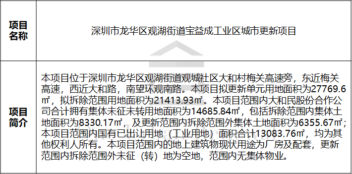 深圳市龙华区观湖街道宝益成工业区城市更新项目合作招商合作方征集公告
