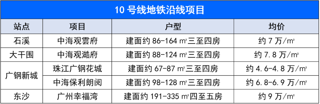 该线路连接番禺和黄埔部分区域,主要途经板块为大学城板块、老黄埔板块和科学城板块,沿线均价在5万左右,产品以刚需、刚改为主,黄埔两个板块的项目周边配套较为完善,比较适合在沿线板块内工作生活的人群。
