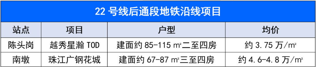 该线路途经嘉禾望岗、白云新城等产业成熟片区,主要功能也是连通白云板块内部,目前沿线在售项目不多,均为改善性住宅,价格*高的是岗贝站周边的粤海云港城,均价约8.5-10万/平。二十二号线后通段(陈头岗—芳村)土建工程累计完成22%。