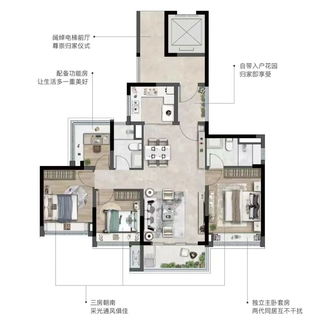 而广府壹号95平三房户型独特之处在于拥有独立入户花园,私密性较好。