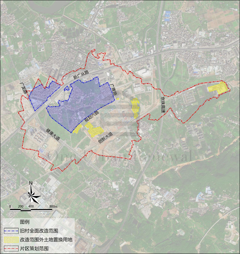 用地范围:综合考虑改造主体权属范围,遵循成片连片、集约用地的要求,划定片区策划范围120.15公顷。现状建设用地以村民住宅和工业用地为主。黄边村改造范围用地面积39.11公顷