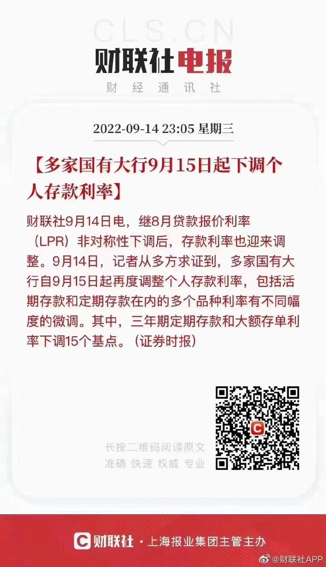 9月15日了解到,工农中建四大行存款利率即日起下调。这是继今年4月个人存款利率下调以来的又一次调降。