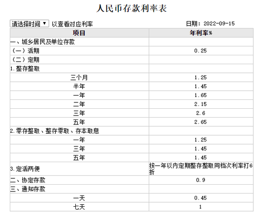 建设银行(5.560, 0.03, 0.54%)APP公布的挂牌年利率显示,9月15日,3个月、6个月、1年期、2年期、5年期定期存款利率分别为1.25%、1.45%、1.65%、2.15%、2.65%,均下降10个基点;3年期定期存款利率为2.60%,下调15个基点。