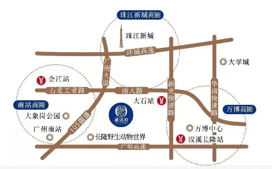 业主通过华南快线15*车程即可抵达珠江新城,前往海珠区则可以选择新光快线,只需10*车程即可无缝接驳新光大桥到达海珠区,而通过105国道仅需10*车程即可连接洛溪大桥和广州大道。