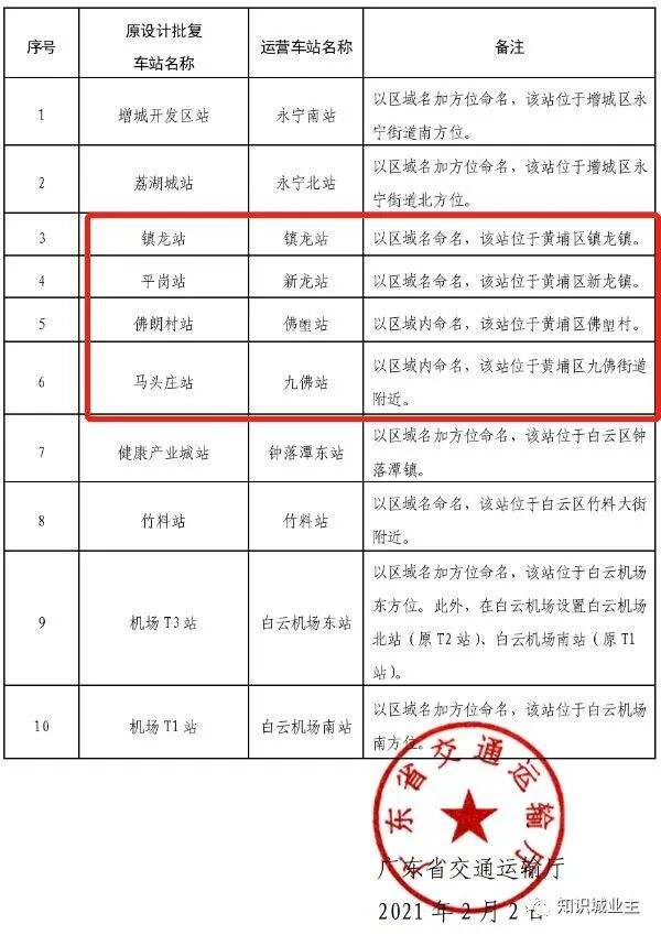 而在今年初,广东省交通运输厅公布关于新白广城际铁路新塘*机场T2段项目车站站名命名方案的批复,正式确定了10座车站的命名。其中设在知识城的4个站点,重新确定了*新车站名称,即镇龙站、新龙站、佛塱站、九佛站。