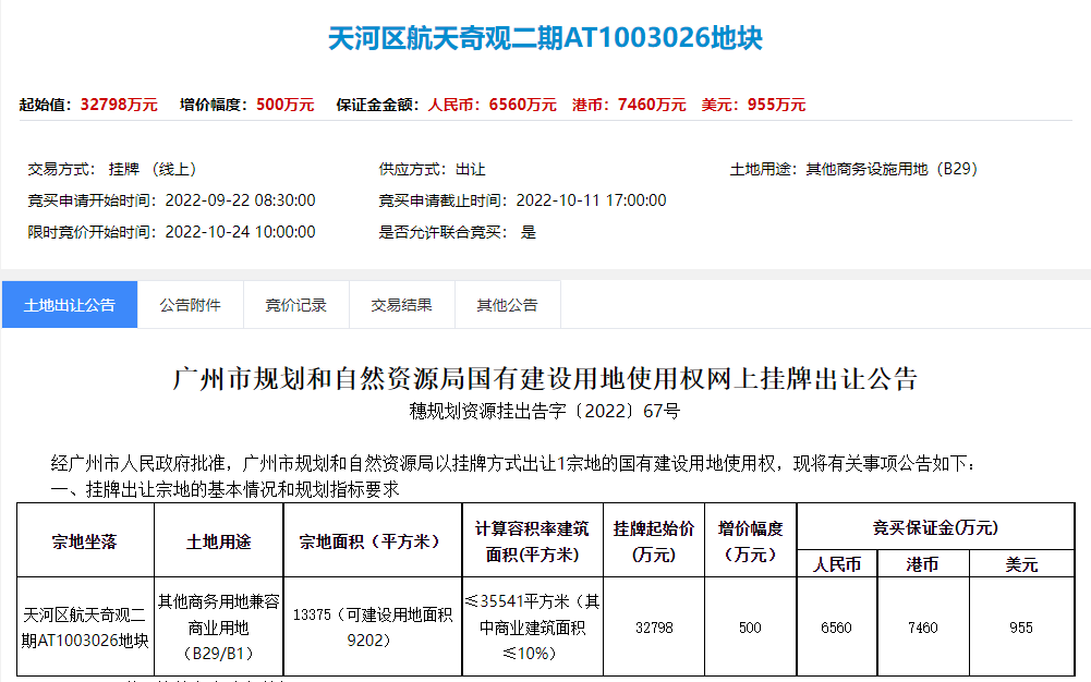 其中,天河区航天奇观二期AT1003026地块要求开发数字文化创意产业和10%以下商业,建筑面积为35541㎡(其中商业建筑面积≤10%),起拍价为32798万元,折合楼面价为9288元/㎡。