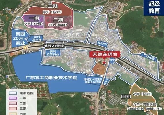 学校:60班初中/高中,一所60班高中(规划中)、99班九年一贯制学校(规划中)、华南师范大学附属双语学校(建设中),广州商学院、广州华商学院、广州农工商学院。