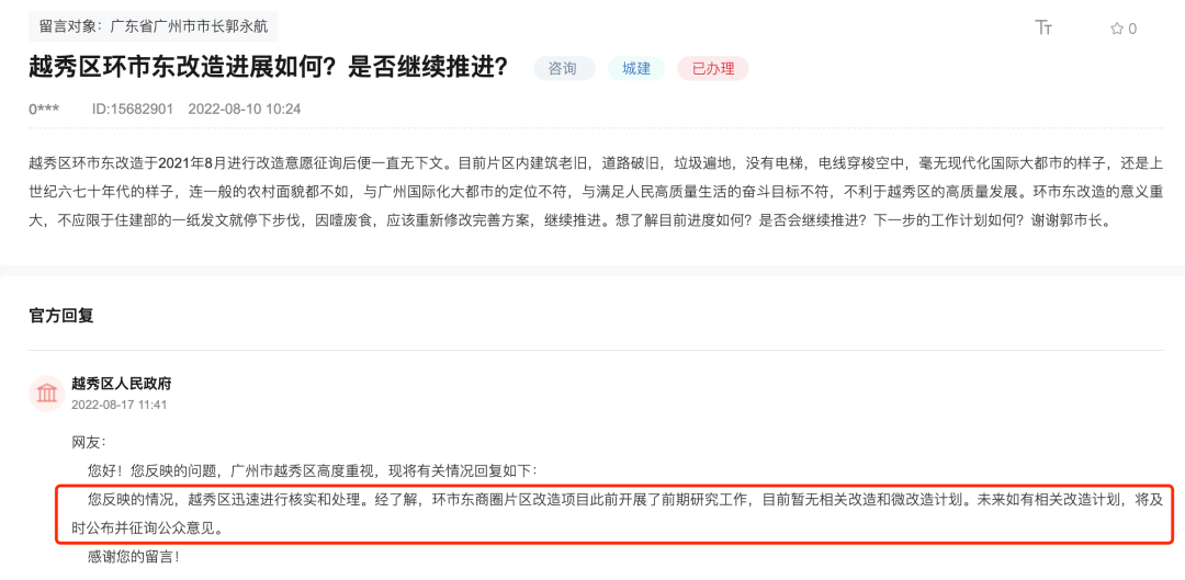 *近官方给出了答案,“经了解,环市东商圈片区改造项目此前开展了前期研究工作,目前暂无相关改造和微改造计划。未来如有相关改造计划,将及时公布并征询公众意见”。不过,按照目前的大趋势,环市东片区未来多偏向“微改造”。*先,要符合“限拆令”要求的拆建比等指标,就需要优化改造方案。其次,征拆困难,环市东片区涉及范围较广,有“老破小”,光东启动区就涉及5600户人。机会渺茫,但不代表没有,如官方回复,*起码没有明确项目改造停止。后续若政策放宽,方案优化,房企生存环境变好,仍有一定的改造希望。