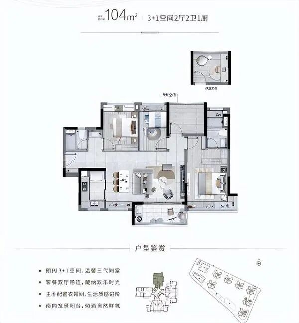 建面约104㎡3+1房,横厅设计,整体看起来比较大气,而且一般横厅设计如果两个房间门向着客厅私密性相对没那多好,这个户型把门口放在侧面,这点算是个加分项。