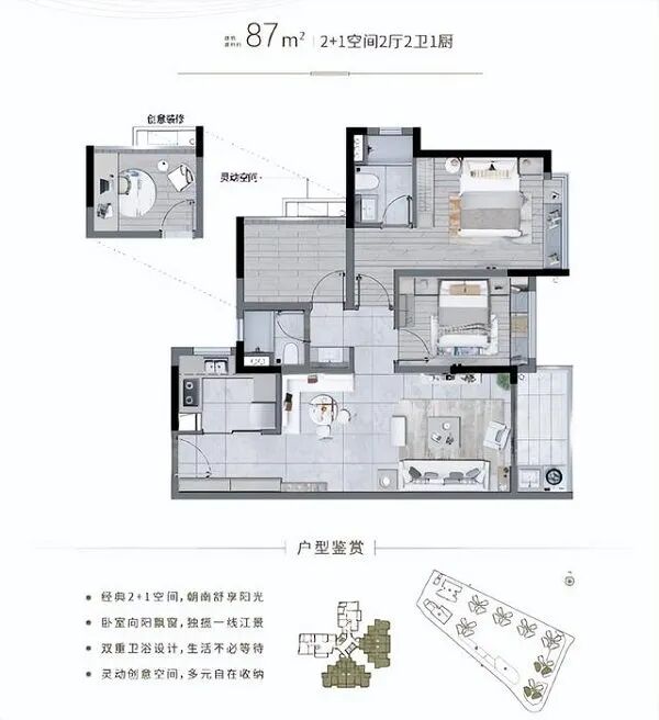 建面约87㎡2+1房,竖厅设计,两卫带主套,没有什么暗卫暗厨硬伤,但也算不上惊艳,只能说是中规中规,刚需上车可以考虑。