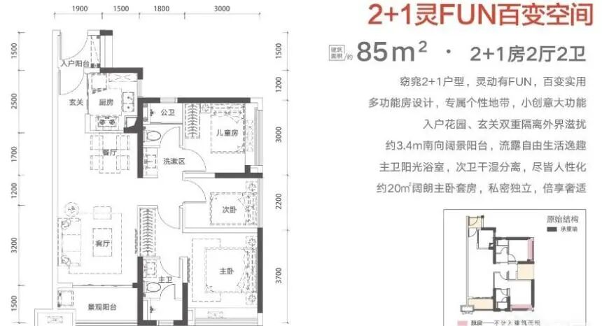 【85㎡3房2卫】2+1户型,灵动有FUN,百变实用;多功能房设计,专属个性地带,小创意大功能;入户花园,玄关双重隔离外界滋扰,私密独立!