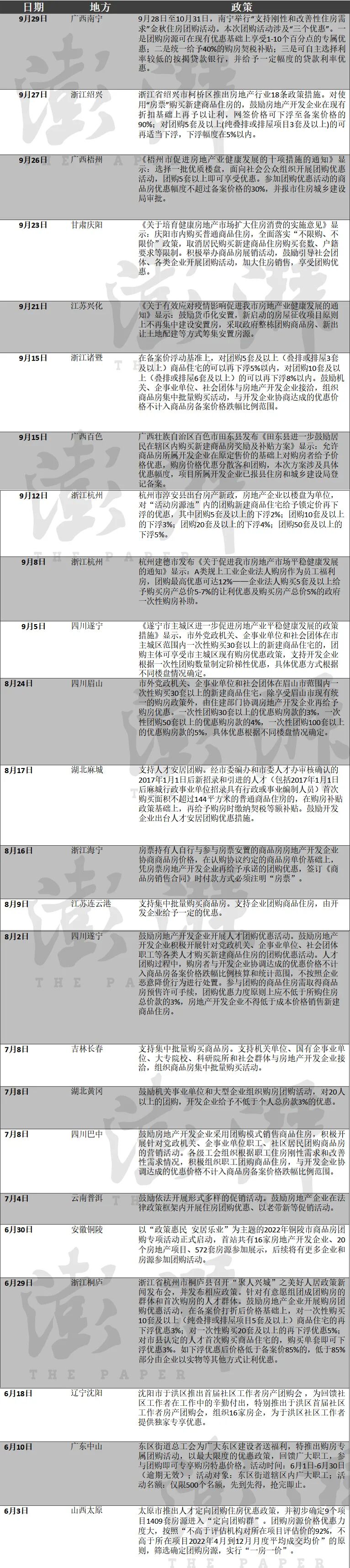 “团购买房”成为各地楼市政策工具箱中的重要内容,多城发文鼓励进行商品房团购。据不完全统计,今年6月以来截*9月30日,*少包括山西太原、广东中山、辽宁沈阳、浙江桐庐、安徽铜陵、云南普洱、四川巴中、湖北黄冈、吉林长春、四川遂宁、江苏连云港、浙江海宁、湖北麻城、四川眉山、浙江杭州、广西百色、浙江诸暨、江苏兴化、甘肃庆阳、广西梧州、浙江绍兴、广西南宁等地发布“购房团购”相关政策或活动。多城发文鼓励进行商品房团购。01鼓励机关单位和国有企事业单位团购在发布“团购买房”的城市中,有部分城市明确鼓励机关单位、国有企事业单位等群体购房。以吉林长春为例,今年7月8日,吉林省长春市政府办公厅发布《进一步促进房地产市场平稳发展若干措施的通知》,《通知》提到,支持集中批量购买商品房。支持机关单位、国有企事业单位、大专院校、科研院所和社会群体与房地产开发企业接洽,组织商品房集中批量购买活动。团购房需取得商品房预售许可,房地产开发企业不得低于成本价格销售。以湖北黄冈来说,湖北省黄冈市制定出台的《关于进一步促进黄冈市区房地产市场平稳健康发展的补充措施》亦提到,鼓励机关事业单位和大型企业组织购房团购活动,对20人以上的团购,开发企业给予不低于个人总房款3%的优惠。四川巴中于7月4日印发《促进市*城区房地产市场平稳健康发展若干措施》的通知,《通知》提到,鼓励房地产开发企业采用团购模式销售商品住房,积极开展针对党政机关、企事业单位职工、社区居民团购商品房的营销活动。各级工会组织根据职工住房刚性需求和改善性需求情况,积极组织职工团购商品住房,与开发企业协调达成的优惠价格不计入商品房备案价格跌幅比例范围。此外,浙江诸暨、四川遂宁、四川眉山等地也均鼓励机关单位、国有企事业单位等群体购房。诸葛找房数据研究**分析师陈霄提到,从推出该类政策的城市来看,以部分弱二线及三四线城市为主,这部分城市多具备库存压力大、去化难等特征,通过鼓励团购买房,可以促进商品房去化,减轻库存压力,缓解购房观望情绪。鼓励部分国有企事业单位开展此类活动,一方面这部分群体本身具备购买实力,另外也能起到一定的带头示范作用。02团购优惠幅度大,一地房价可优惠30%在发布“购房团购”政策的城市中,鼓励房地产企业开展团购优惠也是各地政策中的一大特点。以广西梧州市为例,9月25日,梧州市印发《梧州市促进房地产业健康发展的十项措施的通知》,《通知》提到,提供优质房源开展团购优惠活动,从本措施印发之日起*2022年12月31日,在房地产开发企业自愿的原则上,选择一批优质楼盘,面向社会公众组织开展团购优惠活动,团购5套以上即可享受优惠。参加团购优惠活动的商品房优惠幅度不超过备案价格的30%,并报市住房城乡建设局审批。鼓励企业团购住房用于企业人才安置,购买20套以上且5年内过户到企业职工名下的,在过户过程中给予50%地方留成交易税费补贴。这也意味着,参与团购优惠活动的楼盘,房价*多可优惠30%。也有一些地方按购房套数实行差异化优惠政策。以浙江桐庐县为例,政策显示,鼓励房地产企业开展购房团购优惠活动,在备案价打折后价格基础上,对一次性购买10套及以上(纯叠排或排屋项目5套及以上)商品住宅的再下浮优惠3%;对一次性购买20套及以上的再下浮优惠5%;对市县认定的人才*次购买商品住宅的,购买单套即可下浮优惠3%。8月24日,澎湃新闻从四川省眉山市政府官网获悉,眉山市住房和城乡建设局牵头拟定《市外在眉团购新建商品住宅配套政策(征求意见稿)》,并向社会公开征求意见。《征求意见稿》显示,市外团体在眉山一次性团购30套以上的优惠购房款的3%,一次性团购50套以上的优惠购房款的4%,一次性团购100套以上的优惠购房款的5%。03政策效果有待观察在58安居客房产研究院分院院长张波看来,各地开启商品房团购活动的目的,是促进整个市场活跃度和销量的提升,加快市场信心的恢复。团购的方式,主要是对于团购期间的楼盘价格进行一些打折优惠促销,以此来拉动购房者入市的脚步。团购的作用各地会有明显分化:如果城市供大于求比较严重,整个市场信心依然处于相对底部的话,那么团购所起到的提振效果就相对有限;而对于一些已经触底并开始回升的城市来说,团购所起到的作用会更加明显。同时,业内人士也指出,“购房团购”的落地效果,还需视当地供需情况以及当地楼市现状等因素分类看待。以浙江桐庐为例,“购房团购”落地一个月,《钱江晚报》报道显示,尚未出现过成功的团购案例,开发商也表示即使他们愿意给出优惠,但是要达到团购条件还是比较困难的。同时,有开发商表示,团购打折这一促销手段,对大户型的带动作用微乎其微,“桐庐本地限网签价,打折*低只能到备案价的8.5折,不能再往下打折。虽然楼盘的成交量比之前上来一些,但客户还是不多。”诸葛找房数据研究**分析师陈霄提到,近期以来,多地出台了团购购房的政策,旨在拉动销售,促进去化,提振市场信心等,当然该项政策也能带动一批购买力比较强的人群,即机关单位和企事业单位的员工,带动一部分购房需求的释放。但是值得注意的是,目前来看,烂尾、停贷风波事件的负面影响尚未完全消除,购房者观望情绪较浓,因此即使
