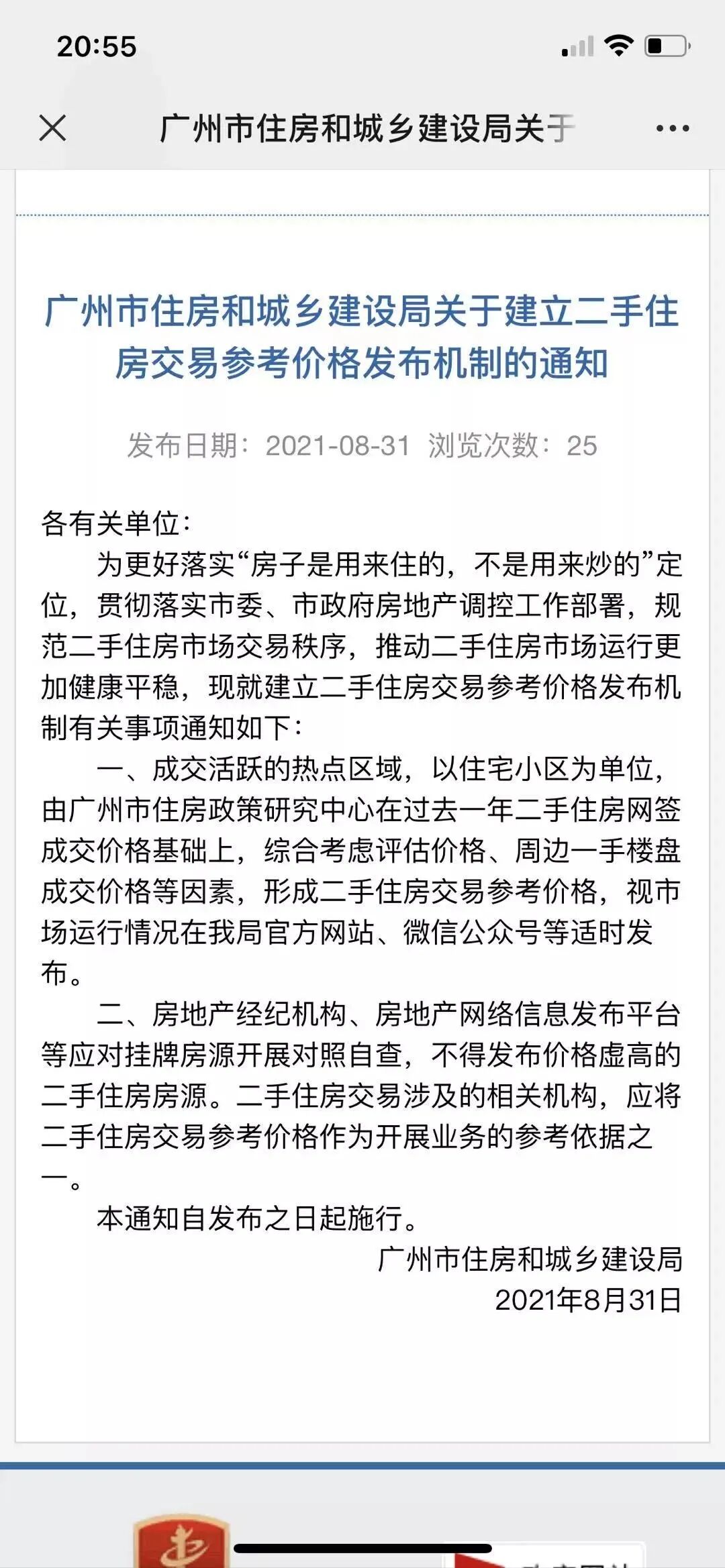 8月31日,广州市住建局发布《广州市住房和城乡建设局关于建立二手住房交易参考价格发布机制的通知》,具体内容如下: