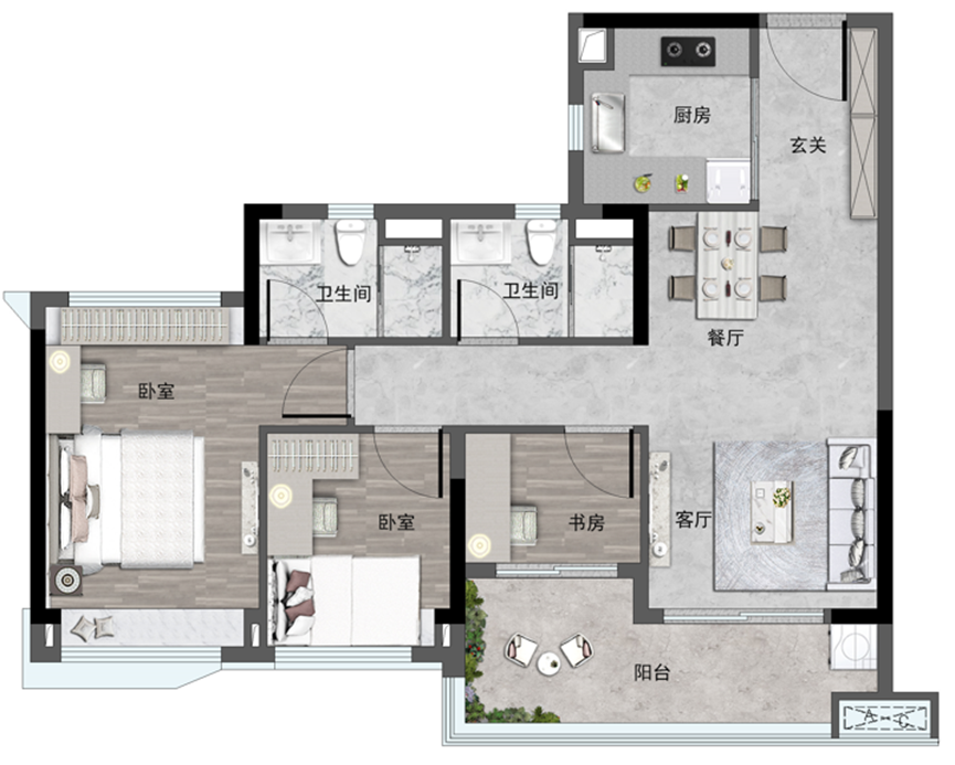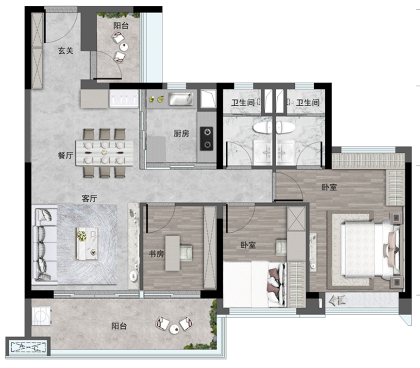 看到这个户型时,乐居君的*反应是:“保利在户型上越来越卷了。”四开间朝南,所有卧室均为南向,市面上很少小户型能做到这个配置。还有L型阳台,单看阳台的话,谁能想到这是75㎡的小三房。不过缺点还是有的,走廊浪费了一点面积,两个次卧的空间比较小,特别是连接阳台的次卧,只能当作书房使用。LDK一体化设计,南北对流的餐客厅,据说开间达6.1米,妥妥的大尺度。