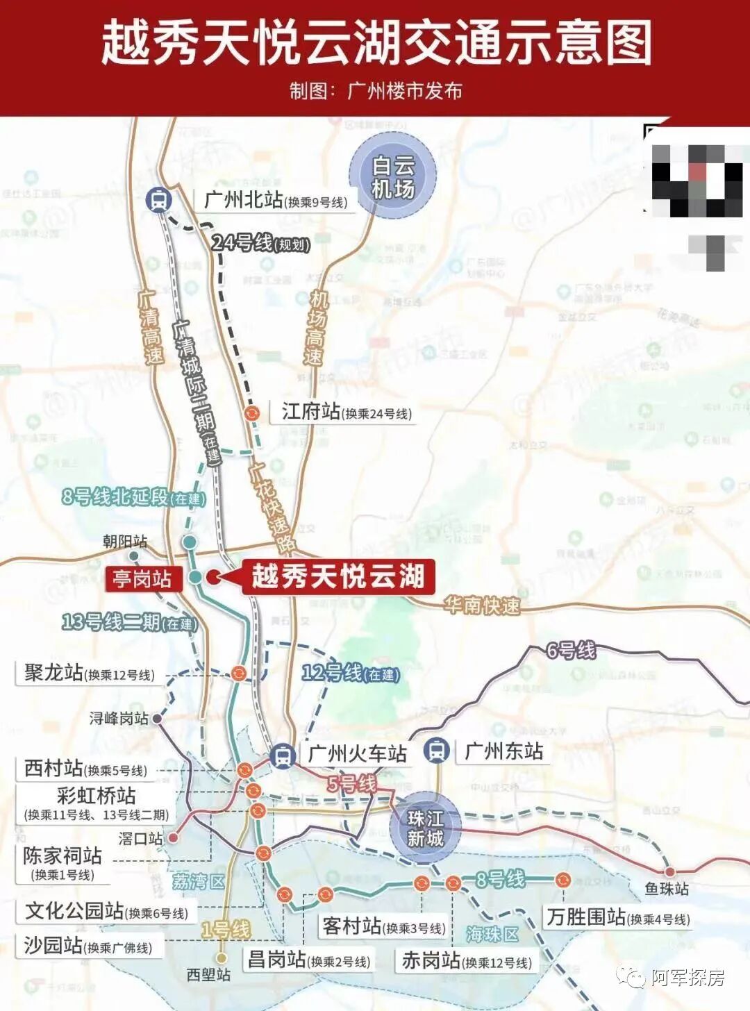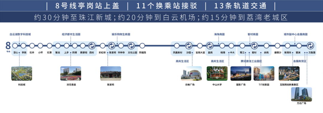 项目距离地铁8号线亭岗站仅100米,通过8号线,11个换乘站无缝接驳13条地铁线路,贯通越秀、荔湾、海珠、天河、花都5大城区。