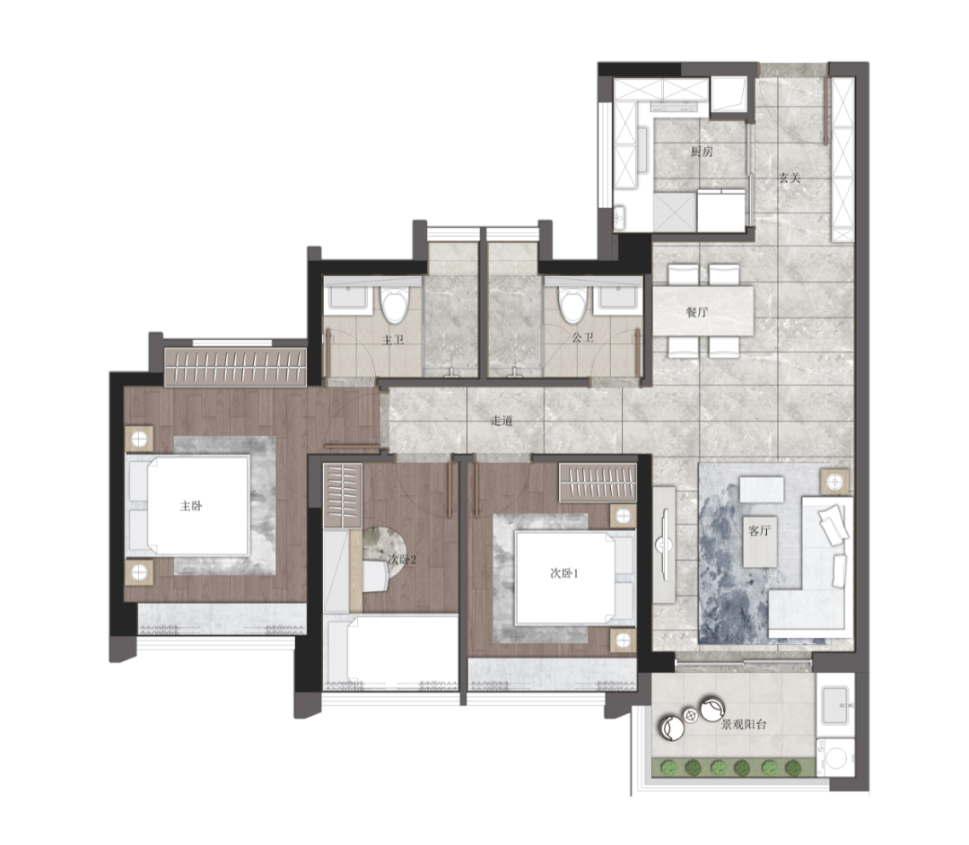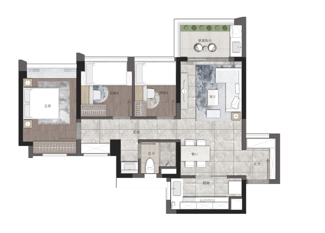客餐厨一线通达,生活起居自在穿行。