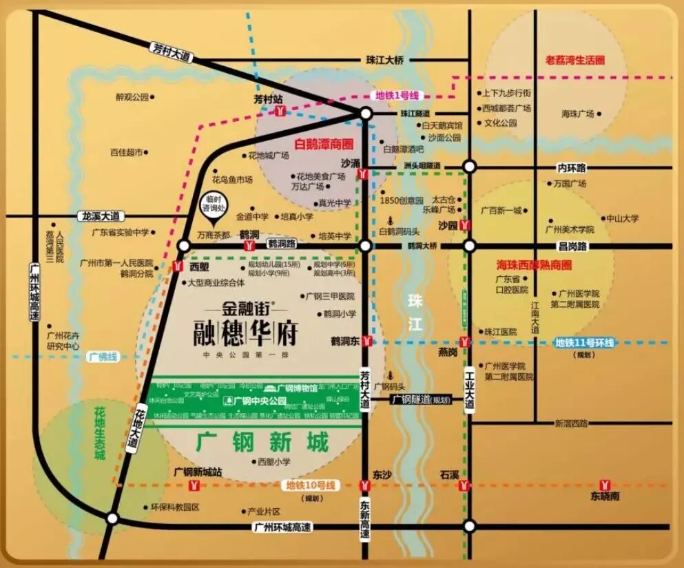 金融街·融穗华府位于广钢新城银沙路与开拓二横路交界处,地处广钢公园排,毗邻广州地铁1号线、广佛线二期(西朗站)。项目总占地约4.8万㎡、计容总建面约23万㎡,容积率4.8,绿化率35%,项目由6栋40层高层洋房和2栋41层安置房组成
