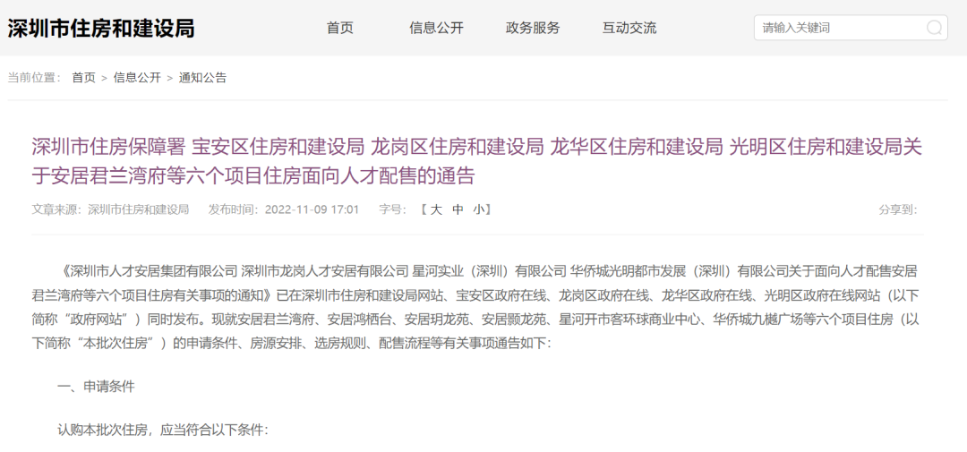 《深圳市人才安居集团有限公司 深圳市龙岗人才安居有限公司 星河实业(深圳)有限公司 华侨城光明都市发展(深圳)有限公司关于面向人才配售安居君兰湾府等六个项目住房有关事项的通知》已在深圳市住房和建设局网站、宝安区政府在线、龙岗区政府在线、龙华区政府在线、光明区政府在线网站(以下简称“政府网站”)同时发布。现就安居君兰湾府、安居鸿栖台、安居玥龙苑、安居颢龙苑、星河开市客环球商业*、华侨城九樾广场等六个项目住房(以下简称“本批次住房”)的申请条件、房源安排、选房规则、配售流程等有关事项通告如下: