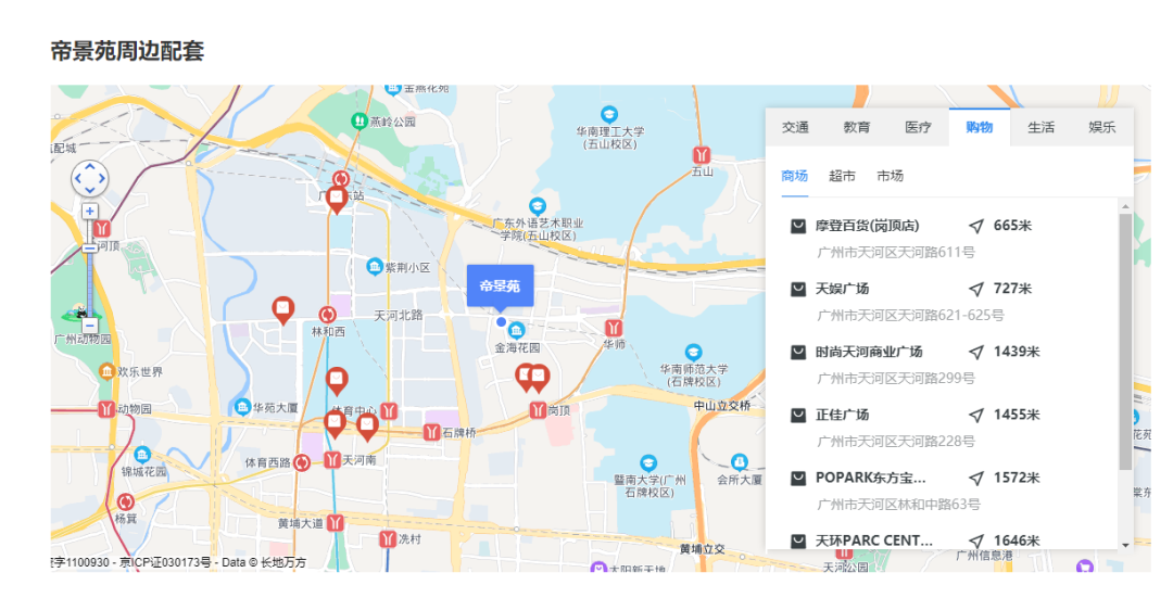 商场:万佳百货(天河北店)、好又多超市、华润万家超市、百佳超市。