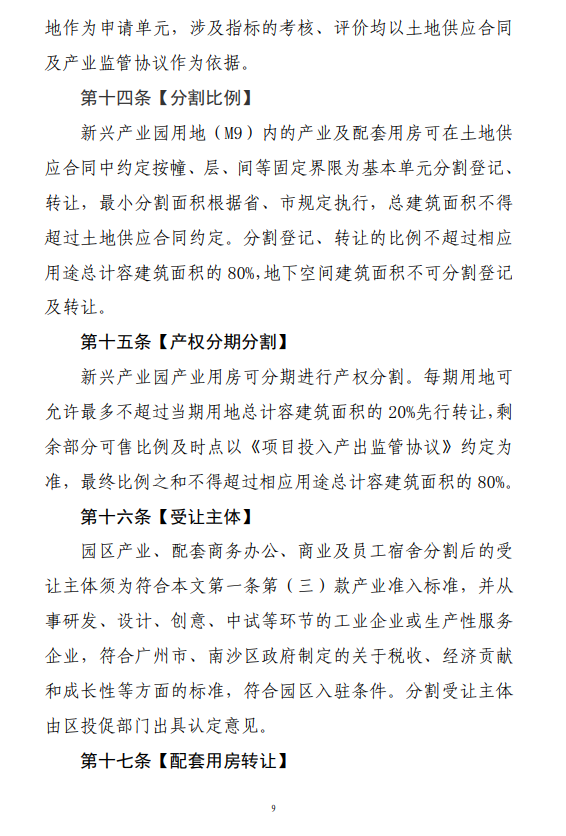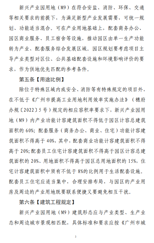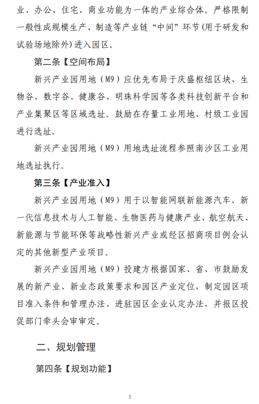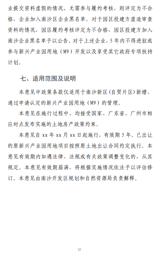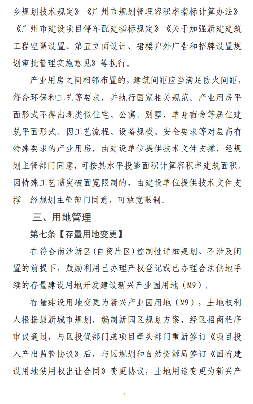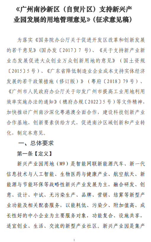 《广州南沙新区(自贸片区)支持新兴产业园发展的用地管理意见》(2022年修订)主要规范南沙新区(自贸片区) 范围内新增、通过申请认定的新兴产业园用地(M9)的管理。