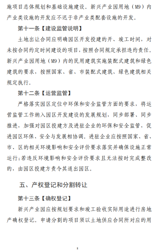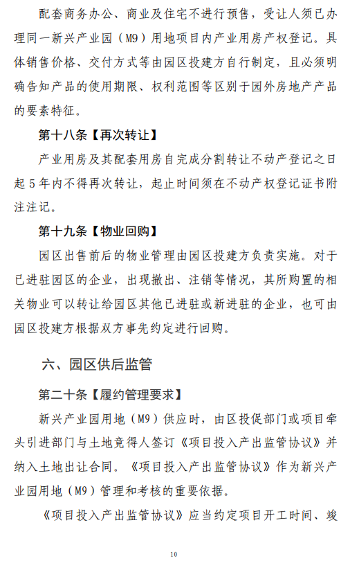 规范用地分割的前置条件,增加分期分割渠道,跟投入产出监管协议投达产约定挂钩;规定用房转让对象须符合产业准入标准,且配套用房转让对象须为已办理园区产业用房产权登记的企业;规范二次转让、退出回购等内容。