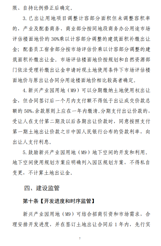 原政策中出让金计价方式为按不同地类用途分别计算楼面价后得出综合楼面价,符合战略性新兴产业优先发展目录和区鼓励发展新兴支柱产业的项目可执行70%优惠。现调整为:产业及配套商务商业按同地段商务办公地价30%、结合自持比例计价,配套住宅按市场价结合自持比例计价,存量用地变更可享受70%优惠。