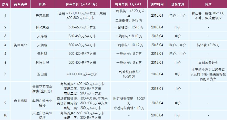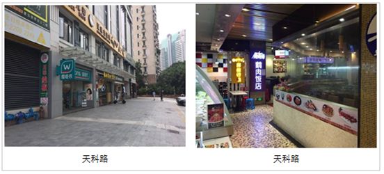 范围挑选了该区的代表性临街商业及集中商业*,包括天河北路、林和东路、天寿路、天润路、天科路、科技东街、五山路、金田花苑商业裙楼、华标广场商业裙楼、天诚广场商业裙楼、曜一城休闲广场等代表性的商业,具体详见下文分析。