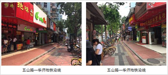 五山路临街商业指由华师地铁站沿线的临街商铺,临街商铺均为20-30㎡的小面积商铺,目前无空置商铺可租,主要的业态为以轻餐饮以及打印店、眼镜店等校园配套为主。