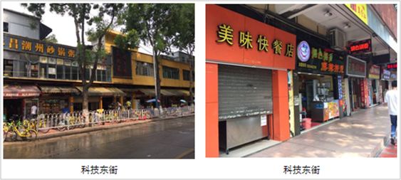 科技东街临街商业指由金山大厦起向南边延伸*华师路段的临街商业。该路段以餐饮店、便利店、五金店为主,商业氛围由北边向南边愈加浓厚。该路段临街商铺均为20-30平方米的小面积商铺,商业氛围一般。