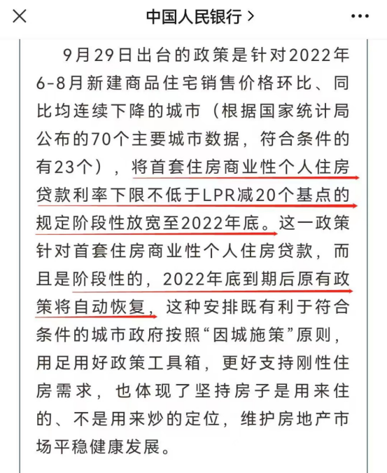 央行于2022年11月16日发布了《2022年第三季度中国货币政策执行报告》。在习近平同志为*的*坚强领导下,我国高效统筹疫情防控和经济社会发展,有效实施宏观政策,*大程度稳住经济社会发展基本盘。国民经济明显回升,2022年第三季度国内生产总值(GDP)同比增长3.9%,比第二季度加快3.5个百分点;前三季度居民消费价格指数(CPI)同比上涨2.0%,在全球高通胀背景下继续保持物价形势的基本稳定。加大稳健货币政策实施力度稳字当头、稳中求进,扎实落实稳经济一揽子政策和接续措施,加大稳健货币二是政策实施力度,坚决支持稳住经济大盘。一是保持流动性合理充裕。二是持续发挥结构性货币政策工具作用。三是持续深化利率市场化改革,发挥贷款市场报价利率(LPR)改革效能和指导作用。四是把握好内外平衡深化汇率市场化改革。五是牢牢守住不发生系统性金融风险的底线。同时,也明确提到,推动保交楼专项借款加快落地使用并视需要适当加大力度。利率放宽2022年底到期后 原有政策将自动恢复《报告》特别指出,2022年9月29日,人民银行、银保监会发布通知,决定阶段性放宽部分城市*套住房贷款利率下限。符合条件的城市政府,可自主决定在2022年底前阶段性维持、下调或取消当地新发放*套住房贷款利率下限。9月29日出台的政策是针对2022年6-8月新建商品住宅销售价格环比、同比均连续下降的城市(根据国家统计局公布的70个主要城市数据,符合条件的有23个),将*套住房商业性个人住房贷款利率下限不低于LPR减20个基点的规定阶段性放宽*2022年底这一政策是阶段性的,2022年底到期后原有政策将自动恢复,这种安排既有利于符合条件的城市政府按照“因城施策”原则,用足用好政策工具箱,更好支持刚性住房需求,也体现了坚持房子是用来住的、不是用来炒的定位,维护房地产市场平稳健康发展。《报告》称政策出台后,一些城市政府积极响应,作出了相应调整。山东济宁、湖北黄冈、广东清远和阳江、浙江温州和舟山等城市,已将当地新发放*套住房个人住房贷款利率下限调整为LPR减35个基点*LPR减60个基点,降幅在15个*40个基点之间;湖北、广东部分城市阶段性取消了当地新发放*套住房个人住房贷款利率下限。)LPR连续三月未变 贷款利率稳定在历史低位五年期LPR自8月下调*4.3%后进入相对稳定期,在*及各地因城施策下,目前房贷利率稳定在历史低位。2022年10月103个*城市主流*套房贷利率为4.12%,较上月继续下降3个基点,二套利率为4.91%。其中石家庄、贵阳、天津、武汉、宜昌等超10城*套房贷利率降*4%以下。本次央行报告中再度明确2022年底到期后原有政策将自动恢复,给政策再次明确了有效期。对于刚需改善需求的释放,年底前是购房红利窗口期。楼市加速进入健康发展、良性循环状态。这意味着,年底政策或会变化,目前是非常珍贵的窗口期,掌握了时间,就把握了主动权。下一步,人民银行将继续坚持房子是用来住的、不是用来炒的定位,全面落实房地产长效机制,因城施策实施好差别化住房信贷政策,更好满足购房者合理住房需求,促进房地产市场平稳健康发展。 来源:广州房产之家