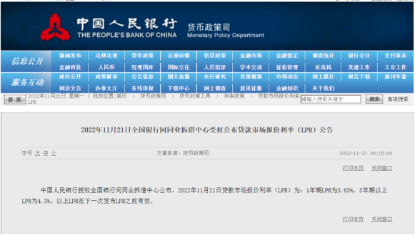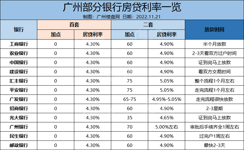 *新LPR出炉啦!!中国人民银行授权全国银行间同业拆借*于11月21日公布,2022年11月21日贷款市场报价利率(LPR)为:1年期LPR为3.65%,5年期以上LPR为4.3%,以上LPR在下一次发布LPR之前有效!!值得一提的是,两者均与上月持平!!*此,LPR已连续四个月按兵不动了!有业内人士认为,本月LPR利率按兵不动是符合市场预期的,因本月15日中期借款便利(MLF)利率保持不变,因此市场对LPR利率维持稳定已有预期!今年以来,央行已经三度下调5年期以上LPR共计35个基点,两度下调1年期LPR共计15个基点。回顾往期:今年三次降息分别如下1月20日,5年期以上市场利率4.65%降*4.6%,下调5个基点。5月20日,5年期以上市场利率4.6%降*4.45%,下调15个基点。8月22日,5年期以上市场利率4.45%降*4.3%,下调15个基点。 小编在这里也为朋友们收集了各大银行的房贷利率情况!银行之间竞争激烈,目前广州各大银行*套房贷利率普遍为4.30%(LPR+0BP),二套4.90%(LPR+60BP)为主,已经降*低位。随着信贷政策越发宽松,广州各大银行针对*套房贷利率实行不加点政策。据小编了解,广州目前仅剩少数银行二套房贷利率高于5%,四大行及光大、民生、邮政银行等二套利率均已跌破“5”。那除了利率,放款时间也加速进行中。目前而言,广州各大银行的房贷放款时间都相对友好,基本在一个月以内。农业、邮政、民生银行等甚*把时间缩短在一周以内。加上近期,官方放出的“救市”信号接连而来。人民银行、银保监会于11月11日发布《关于做好当前金融支持房地产市场平稳健康发展工作的通知》出台16条措施支持个人住房贷款合理需求,明确各城市合理确定当地个人住房贷款*付比例和贷款利率政策下限,支持刚性和改善性住房需求。银保监会、住建部、人民银行三部门于11月14日联合发布《关于商业银行出具保函置换预售监管资金有关工作的通知》允许商业银行与优质房企开展保函置换预售监管资金业务,化解房企流动性风险。种种利好加上低利率,你准备买房了吗?想了解更多新房或当前*新政策,赶紧点击窗口联系我们吧! 来源:广州房产之家