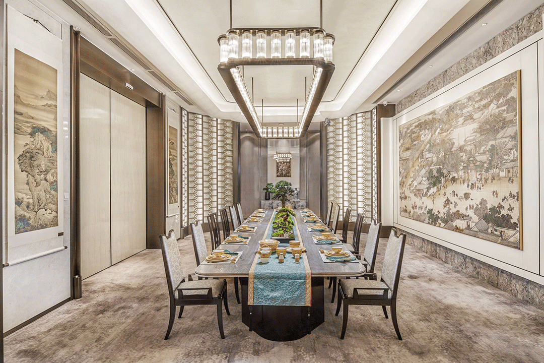 餐厅与厨房相连,从天花、墙面到地板无不经过一番装饰,若是高楼层还能与江共饮,气派的家宴、派对随时能从容上演。