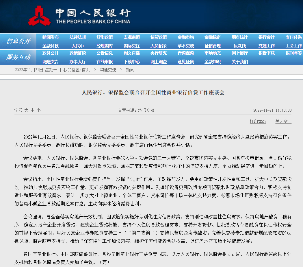 11月21日,央行和银保监会召开了全国性商业银行信贷工作座谈会,研究部署金融支持稳经济大盘政策措施落实工作。