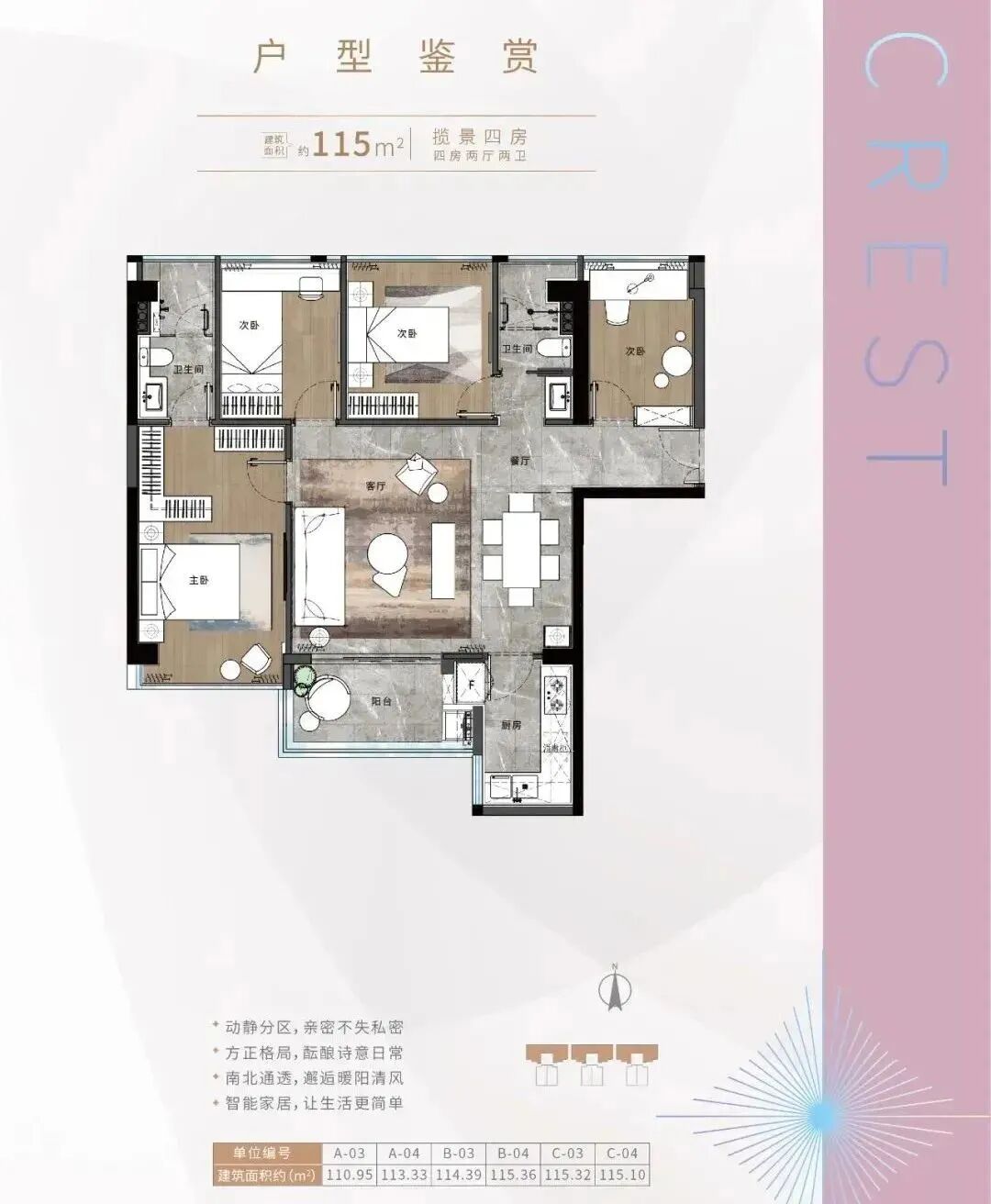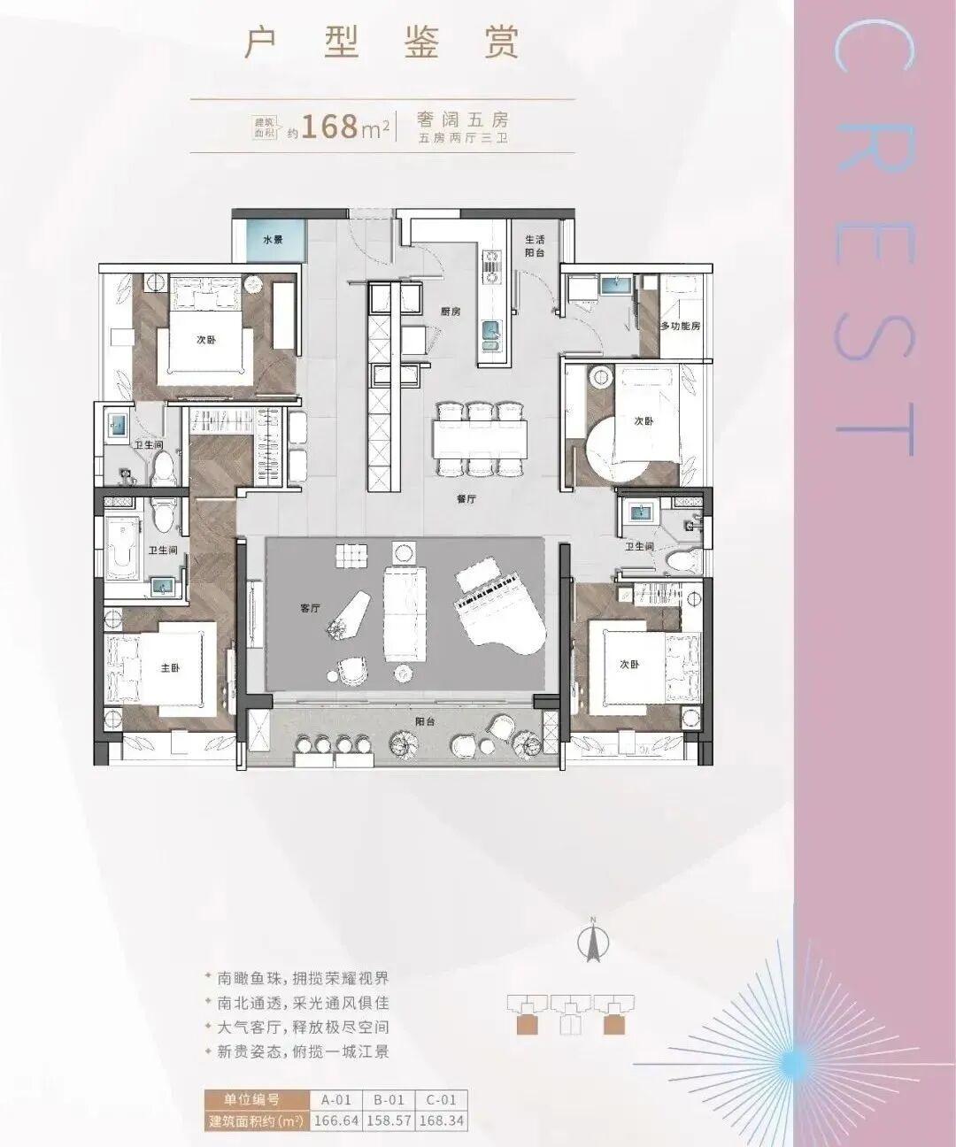 而建面约115㎡四房的设计则中规中距,建面约158㎡五房和建面约168㎡五房设计有横厅和双阳台,南北通透,五房三卫也更符合刚改一族的需求。