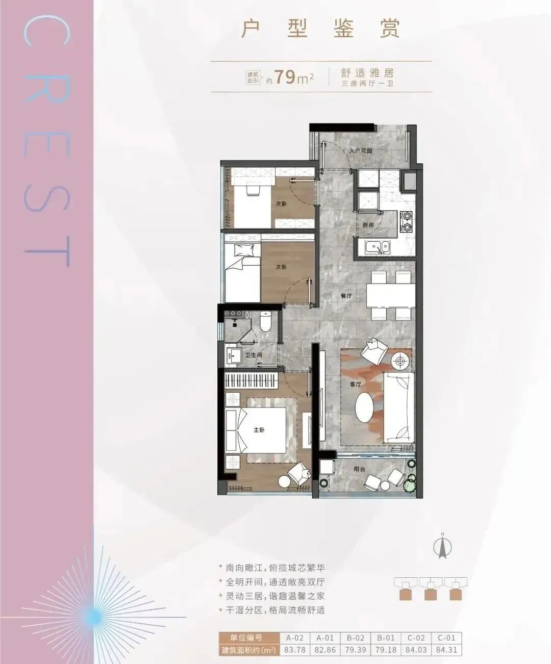 住宅产品中,建面约79㎡三房的使用率较高,但同时空间也相对紧凑。该户型整体进深较深,面宽又比较小,故对采光有一定的影响。