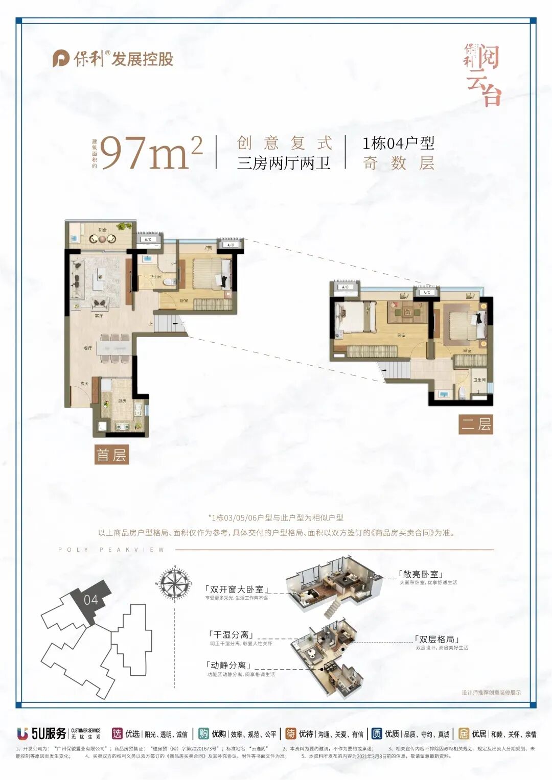 约97㎡的户型,3房2卫2卫设计,白云区*咬合复式,高赠送面积,*户型; *小卧室面积10m,*大卧室面积17m; 相比之前纯北向,此次推出的是西南向产品; 光照时间通透性更好,目前白云*高住宅,景观无敌。