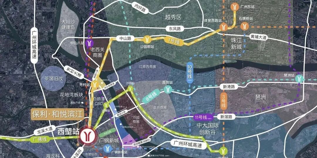 事实上,不仅仅如此,项目所处的白鹅潭商圈,交通路网四通八达,总计将有13条轨道汇聚于此,所以保利和悦滨江所享受到的地铁红利,超乎想象。