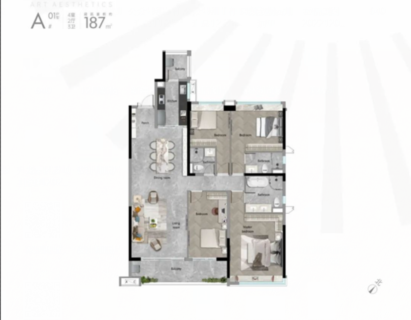 产品上,这一期主推建面约116㎡/128㎡/186㎡四房单位,东南向看山体公园。