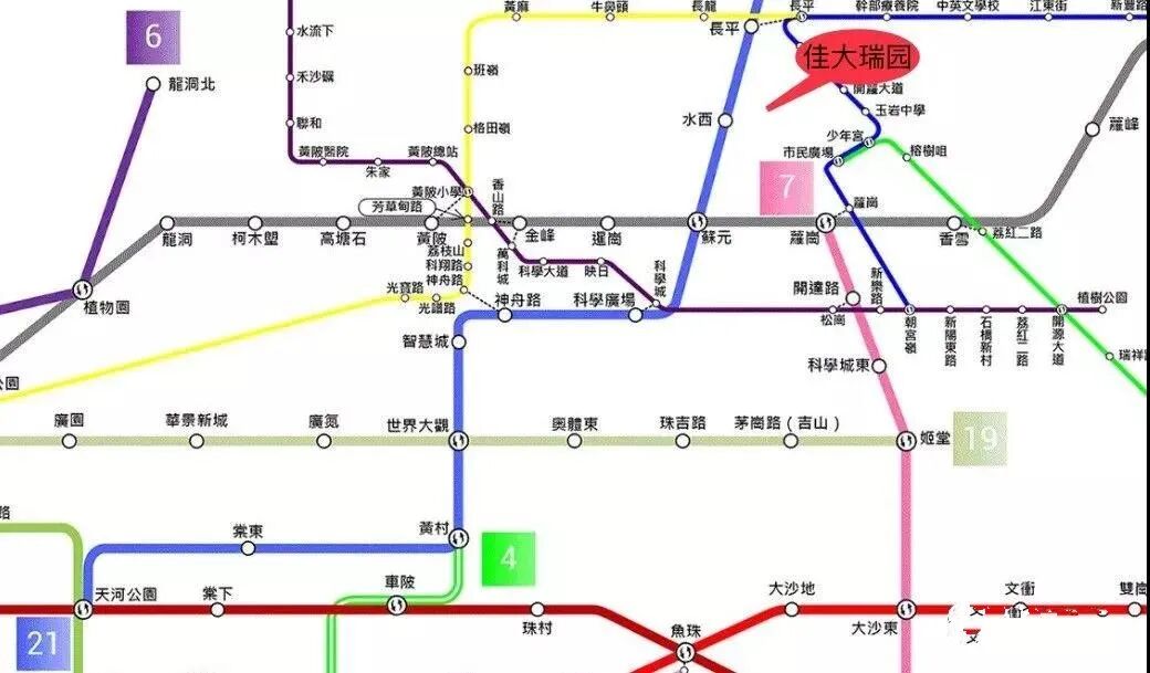 项目距离地铁21号线水西站直线距离约800米,距离地铁7号线二期水西北站(建设中,预计2023年开通)约1.2km,而且门口还有黄埔一号线有轨电车站,算得上是三轨交汇楼盘。