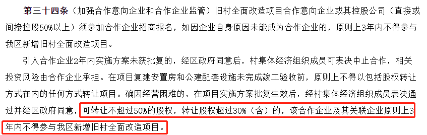 可以说,转让股权管控收紧了,在2020年旧改公告中,是允许转让小于50%股权的,而转让超过30%,才会导致3年内不能拿旧村项目。