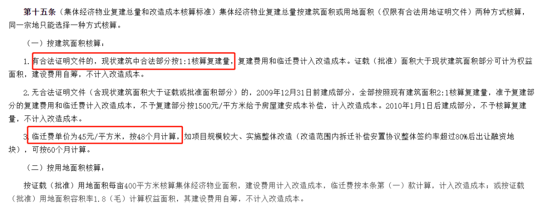 按证载(批准)用地面积每亩400平方米核算集体经济物业面积,建设费用计入改造成本,临迁费按本条第(一)款计算,计入改造成本;或按证载(批准)用地面积容积率1.8(毛)计算权益面积。