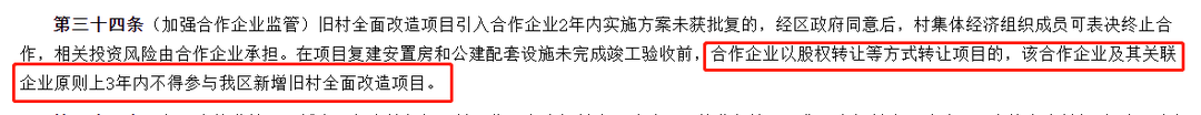 另外,在项目复建安置房和公建配套设施未完成竣工验收前,合作企业以股权转让等方式转让项目的,该合作企业及其关联企业原则上3年内不得参与我区新增旧村全面改造项目。